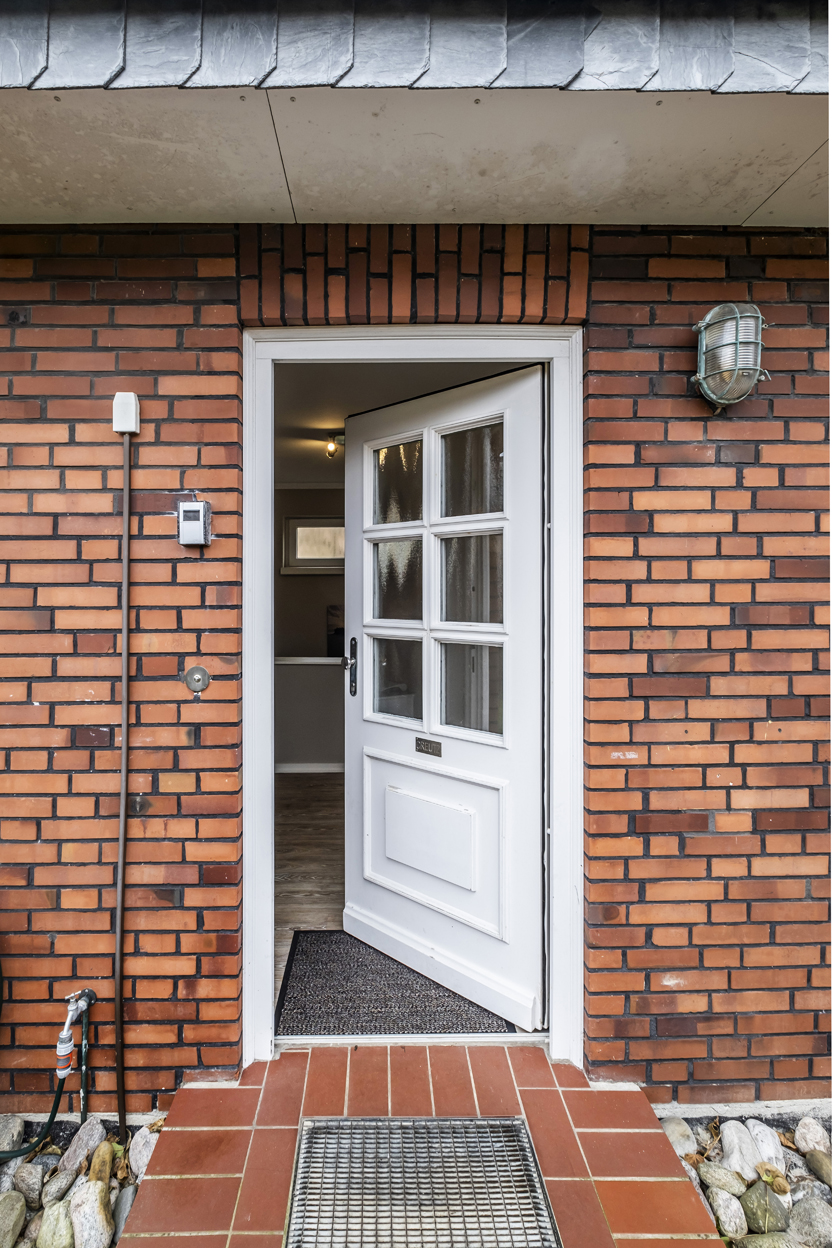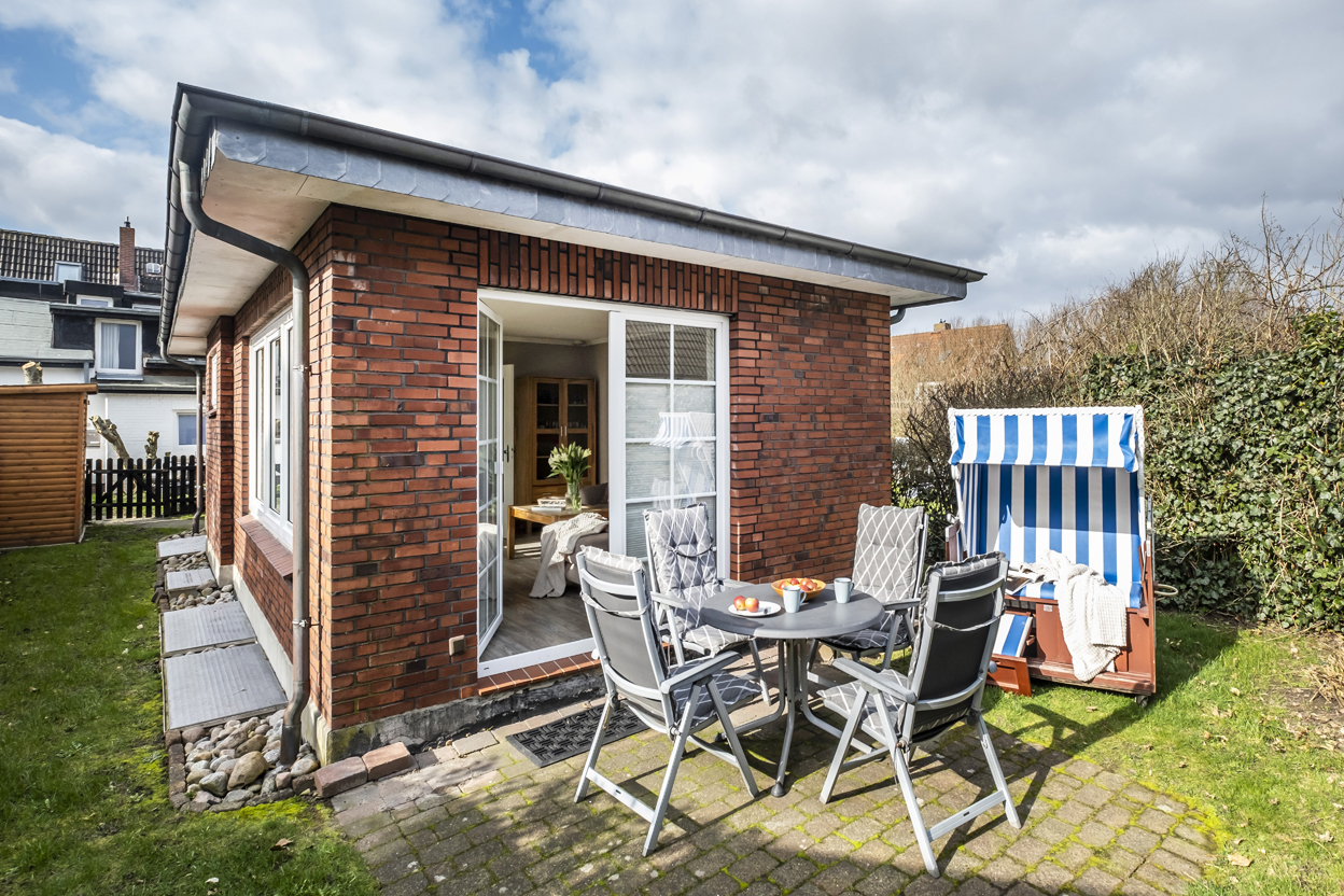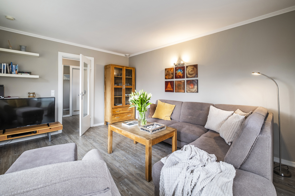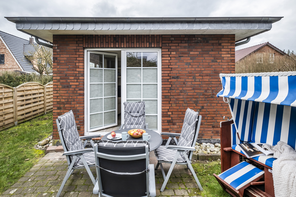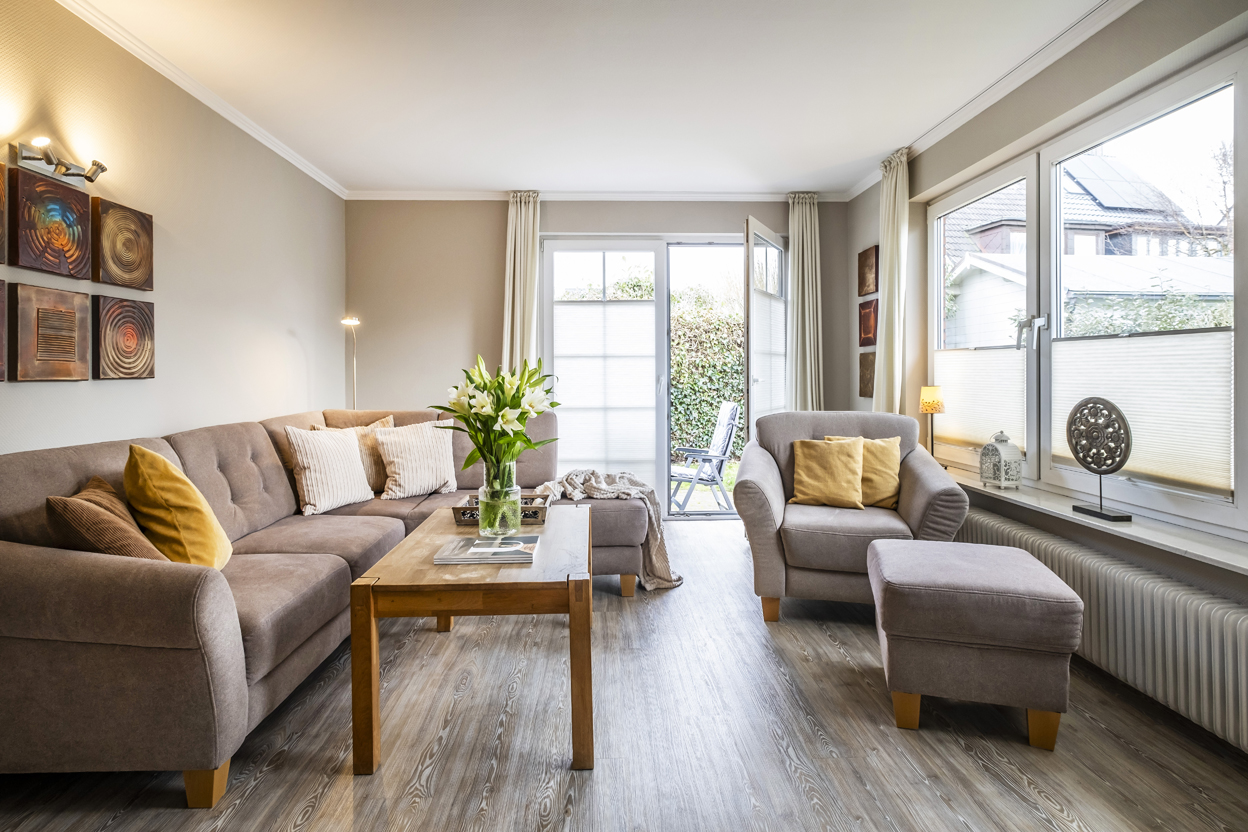 Wohnzimmer mit Designfußboden und Zugang zum Garten mit Flachbild-TV, Stereoanlage mit CD Spieler, Spiele für die Kinder, Bücher zum Lesen etc.