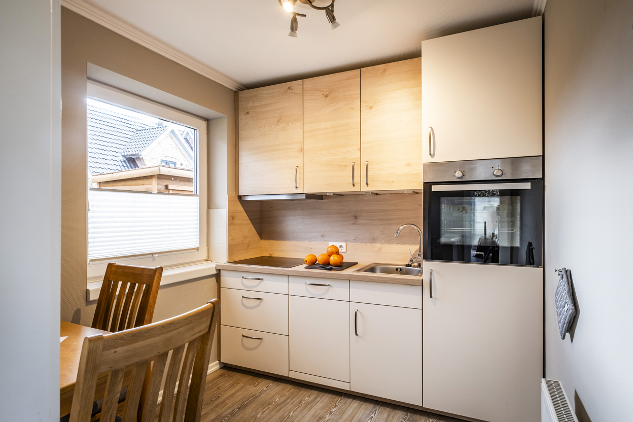Küche mit 4 Platten Cerankochfeld, Backofen, Kühlschrank, Geschirrspüler, div. Ober- und Unterschränke mit Geschirr und Hausrat einschließlich Toaster, Kaffeemaschine und Wasserkocher, etc.