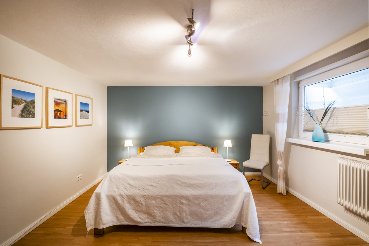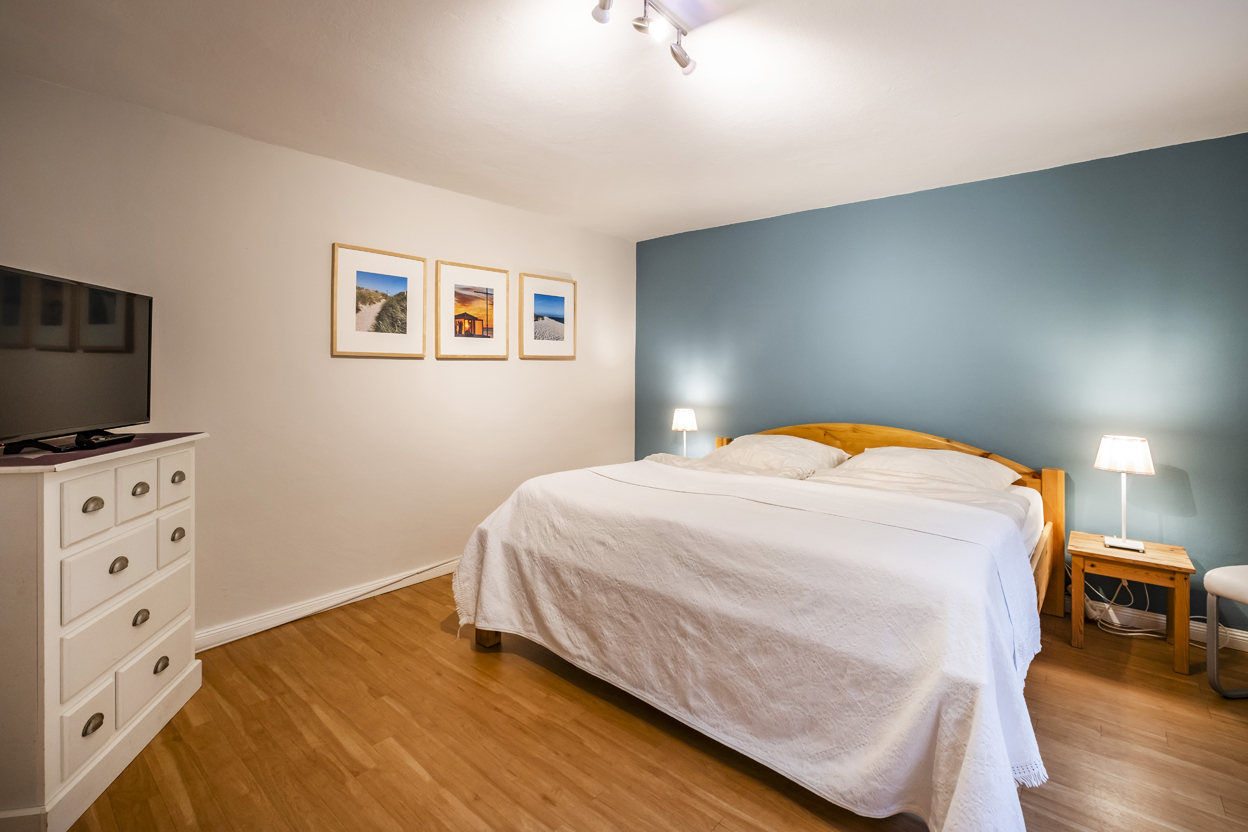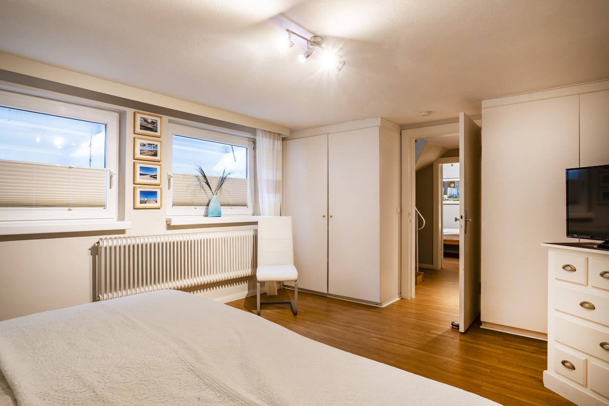 Schlafzimmer mit Doppelbett, großem Kleiderschrank und Kabel-TV