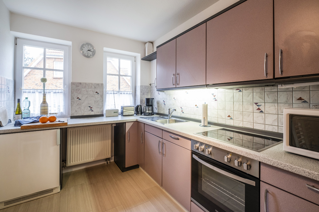 Haus Wiesenblick hat eine sonnige Südterrasse mit unverbautem Blick auf eine Weide mit Pferden und Schafen. Das grosse und helle Wohnzimmer ist hochwertig eingerichtet. Die Küche verfügt über einen Geschirrspüler, einen Kühlschrank mit Gefrierfach, eine Mikrowelle, Kaffeemaschine, Toaster, Wasserkocher und einem Herd mit 4 Kochfeldern. Im angrenzenden HWR befindet sich eine Waschmaschine mit Trockner, Bügeleisen und Bügelbrett. Stellplatz am Haus.